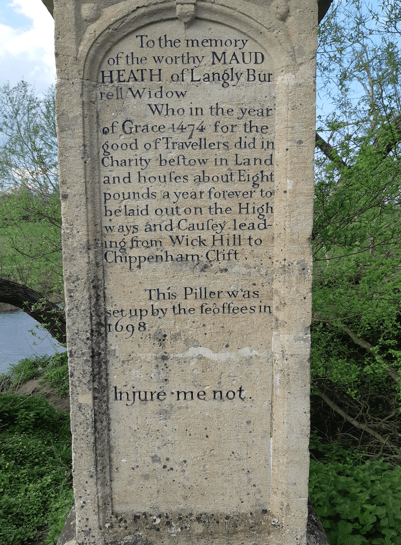 ‘To the memory Of the worthy MAUD HEATH of Langley Burrell Widow Who in the year of Grace 1474 for the good of Travellers did in Charity bestow land and houses about Eight Pounds a year forever to be laid out on the Highways and Causey leading from Wick Hill to Chippenham Clift. This Piller was Set up by the feoffes in 1698 Injure me not’