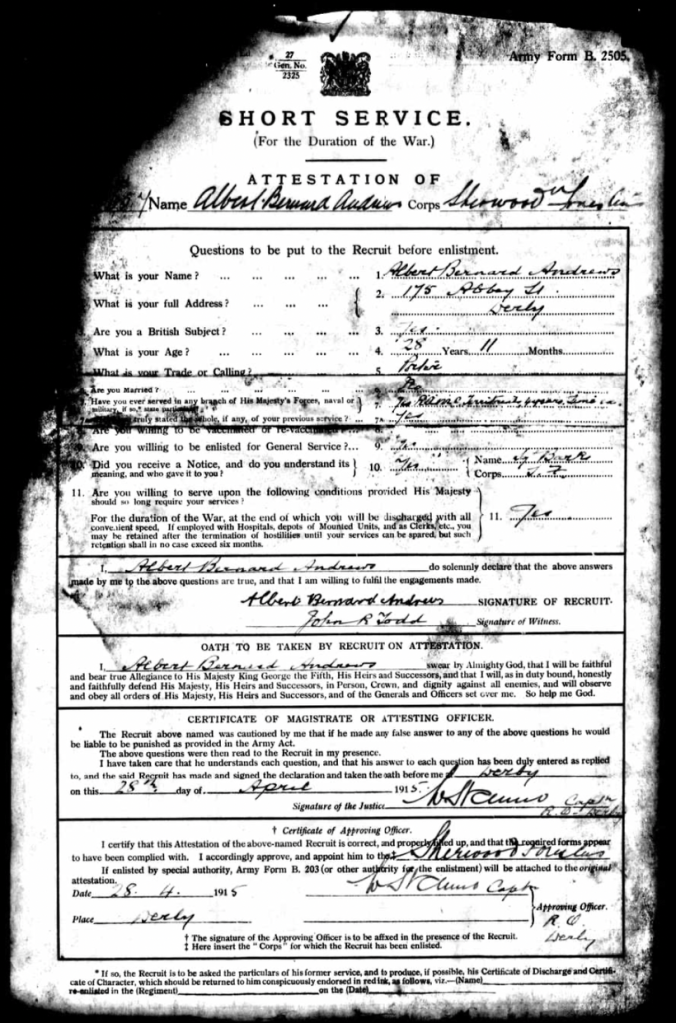Private Albert Bernard Andrews died aged 32 on 19th October 1917. He had signed up to the Sherwood Foresters (Notts and Derby Regiment) 16th battalion on 28th April 1915 and was killed in action in Belgium.