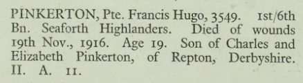 Francis was born around 1898 to Charles and Elizabeth Pinkerton, who were living ‘off their own means’ at 11 Long Street, Repton in the 1911 census. Like Francis Blythe, he also joined the Seaforth Highlanders and joined up as soon as he could.