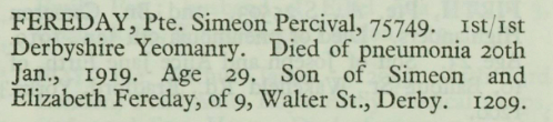 Simeon joined the Derbyshire Yeomanry and survived until the last year of the conflict, when he died of pneumonia on 20th January 1919, aged 29. He was buried in Mikra British Cemetery, Kalamaria, Greece.