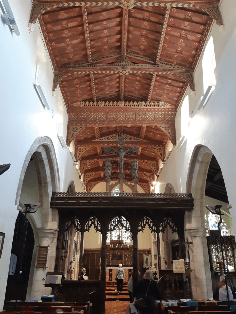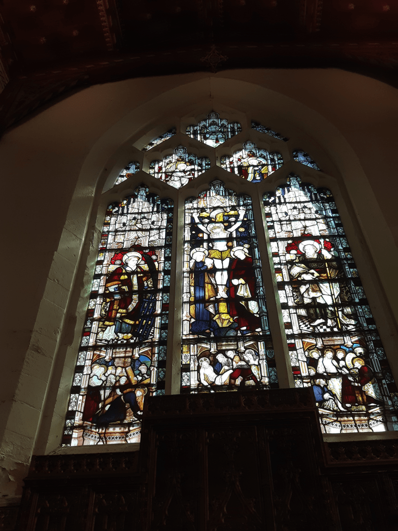 The church interior is a lovely mix of styles and ages; the north aisle is 11th century (enlarged in 14th), the Lady chapel is 13th century and the spectacularly jazzy ceiling is 19th century. The red decorated ceiling is both substantial and a real stunner. Created by G F Bodley in 1884, it features a repeating floral and ‘M’ motif, representing the Magnificat (a prominent and ancient Christian hymn). Beneath this painted delight is a large oak rood screen, topped with a carved wooden sculpture of the crucified Christ. Curiously, the base of the original rood screen was removed in 1565 and sold to local man Thomas Broxholme for 16 shillings. Amazingly, it was rediscovered in storage at the vicarage and re-installed in the church in 1884.