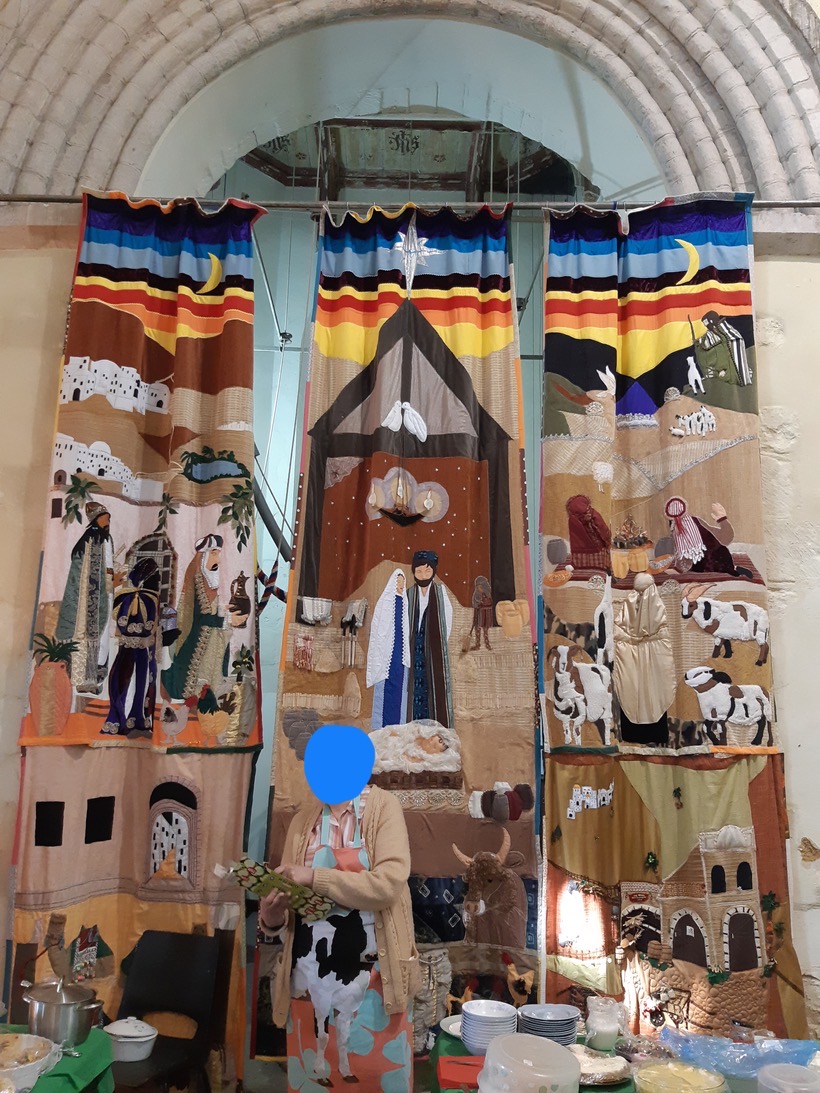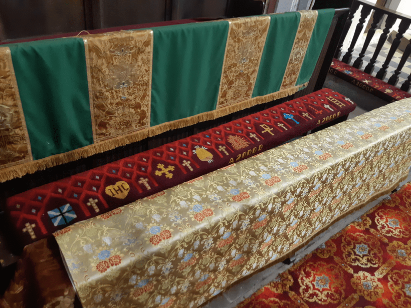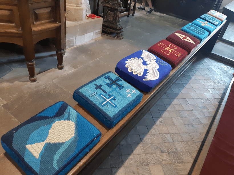 Not noted by any guidebook or online resource is this enormous applique’s triptych wall hanging-slash-curtain which had a rather 80s primary school nativity vibe to it. As an enormous fan of handicrafts, this was just as exciting to me as a corbel, and was a beautiful example of bright and functional art made within a living church. However, my visit was during a churches festival and a full view of this triptych was impossible… owing to a large amount of tea and cake. Tupperware aside, Corringham had several lovely examples of needlecraft, including some lovely, very 70s kneelers.