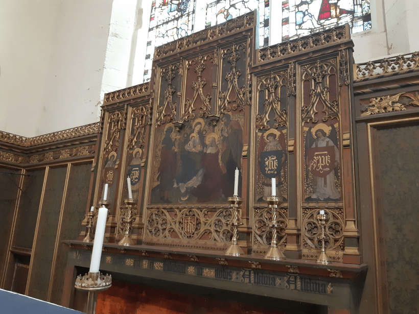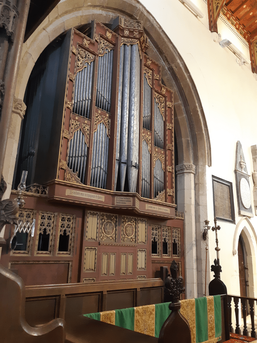 The church organ is perfectly recessed beneath an archway and has been richly decorated in a Victorian gothic style. Installed in 1884, the ‘case’ has been beautifully decorated in black and gold psalms and Latin verses. Much of the church’s fittings, including the organ, candelabrum, rood screen and reredos are all thanks to the 1882 restoration.