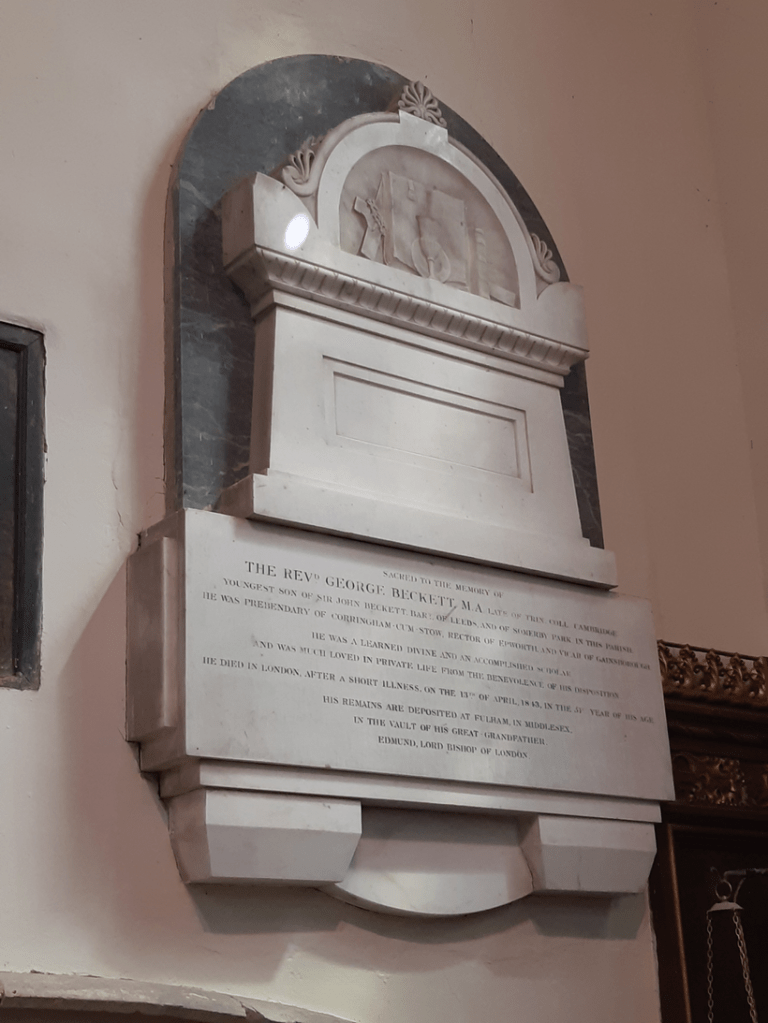 Alongside this plaque are 3 other Beckett memorials from the 19th century – Richard Beckett, John Beckett and the Rev. George Beckett, whose memorial is topped with a carved decorative likeness of a cross, chalice, bible and other religious ephemera.