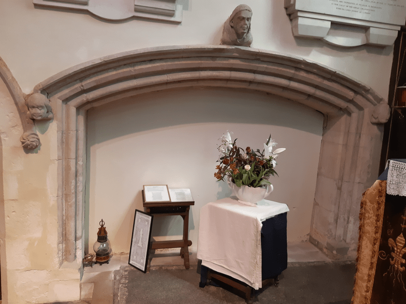 As for memorials, Corringham has a wide selection of styles and decorations. An Easter Sepulchre has been reused as a memorial space for the tomb of William de Gare (1277-1290), the Archdeacon of Lincoln. The wall memorials are a mixture of materials and ages – one far older metal memorial is in Latin and features a crest with three board heads (I’d presume the crest of Grimsby), but little information was available online and I didn’t have a stepladder with me to inspect it closer. Another plaque is so dark and discoloured from years of display, that it is all but illegible. However, after guessing that it was 17th century, a bit of internet snooping revealed that this is the memorial to 1628 Rev Canon Henry Clifford, vicar from 1609-1628. It’s topped with an engraving of him and his wife Elinor.