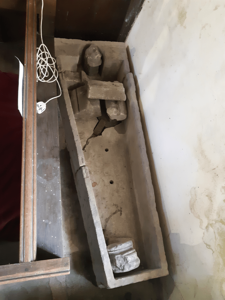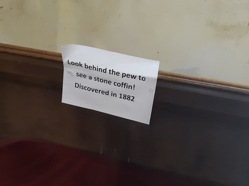 Windows and wood aside, the best church treasures are usually found covered in cords, or behind dodgy signage, and Corringham was no different. Behind a pew and a blu-tacked sign, was a large stone coffin. Discovered beneath the altar during 1882 restorations, this medieval coffin has no provenance and lives out its life as a nameless curiosity. While the coffin has some substantial damage, including a few nasty breaks across the whole body, it’s a lovely, thin and square example of an old form. Mainly used for nobility, clergy and people of standing, it was a functional method of burial, as circular holes in the bottom offered a means of drainage for the decomposing body.