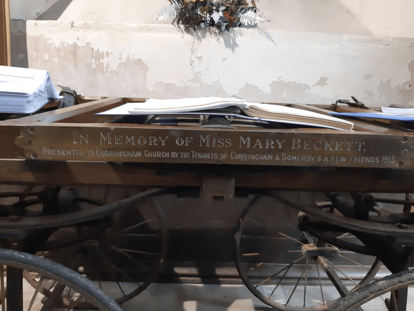 In other death-related treasure hunting, the old parish bier was on display, used as a table to display an array of binders, filled with local history and parish records. There was no other information on display, save for the brass plaque reading ‘In Memory of Miss Mary Beckett, Presented to Corringham Church by the Tenants of Corringham and Somerby and a few friends, 1915’. Biers were wooden carts, used as hearses for centuries – the coffin would be placed on top and wheeled to the graveside, ready for burial. Naturally, many ended their lives on the scrapheap, so to see any complete example in a church building today is always a real joy.