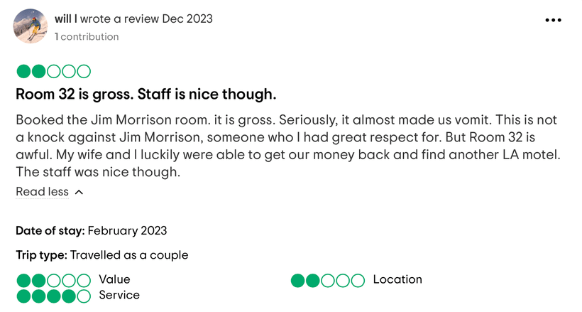 Regarded as a profound pilgrimage site for fans of The Doors, the mundane room was transformed into a psychedelic mass of scribbles and lyrics, becoming a sitting, grimy memorial to Morrison’s musical and poetic legacy (for a man who reportedly wore the same pair of trousers for two-solid-years, grimy seems very appropriate). While Jim’s room may well have made for a profound fan visit, as a holiday destination, it was far less pleasant. One TripAdvisor review reads ‘Booked the Jim Morrison room. it is gross. Seriously, it almost made us vomit. This is not a knock against Jim Morrison, someone who I had great respect for. But Room 32 is awful. My wife and I luckily were able to get our money back and find another LA motel. The staff was nice though.’