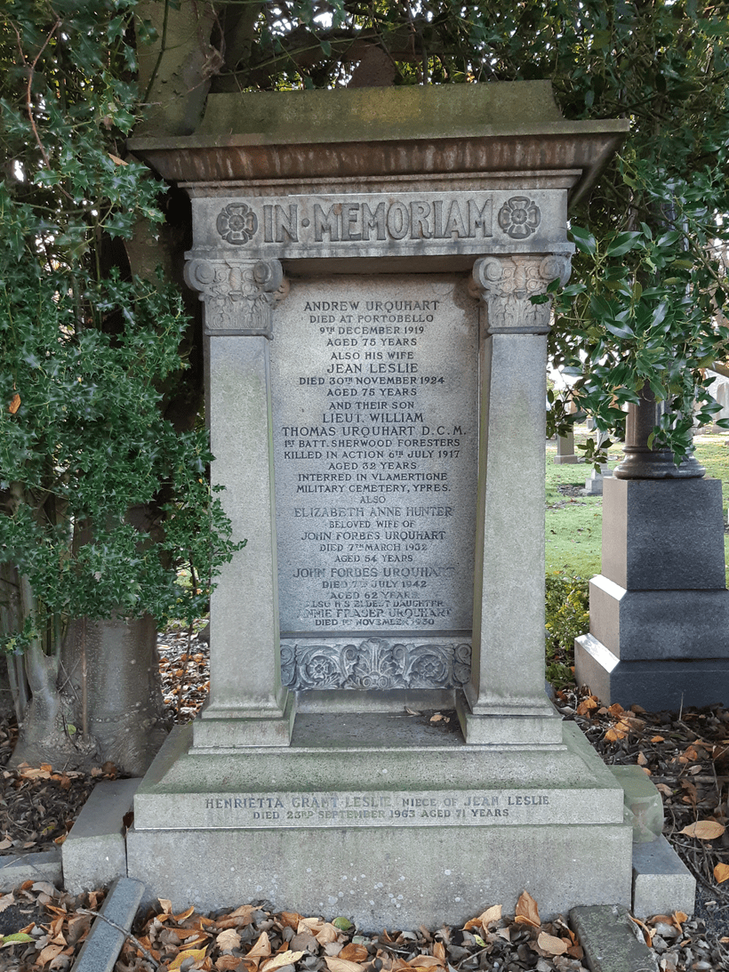 The Urquhart grave is one of the first to be found at the cemetery’s entrance and memorialises several family members, including a war death – Lieutenant William Thomas Urquhart, of the 1st battalion Sherwood Foresters who was killed in action on the 6th July 1917 aged 32. Thanks to the Imperial War Archives, a little of William’s life is accessible to us all. Born in Edinburgh, his first war posting was to Abassia in Egypt, before joining the Australian Imperial Force and later, the Foresters. At the time of William’s death, the 2nd, 1/5th and 1/6th Battalions were fighting in France, attacking the German lines east of Cite St. Theodore, near Lens, France. This particular attack continued for several days with the Foresters enduring massive losses.