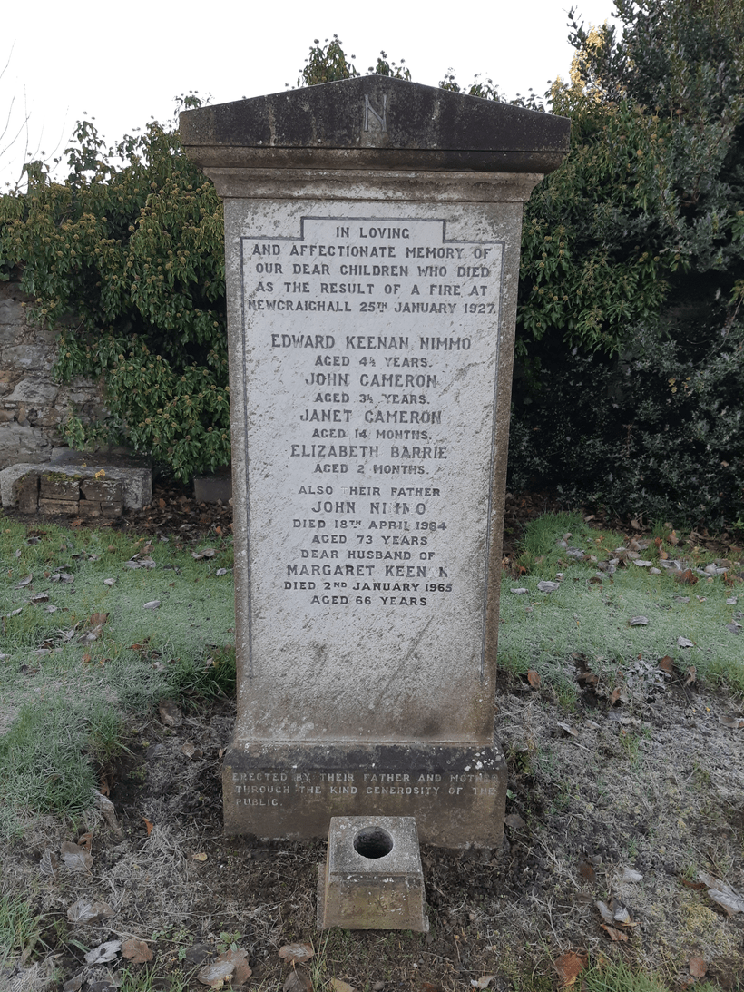 One of the saddest graves in the cemetery is a mass grave to several young children (and later, their parents) who ‘died as the result of a fire at Newcraighill’ on 25th January 1927.