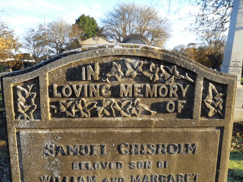 One of these graves with a pleasant design was to Samuel Chisholm, son of William and Margaret Shepherd, who died aged 12 on 19th February 1916. Buried alongside his parents and siblings who all made it to old age, he spent decades in Portobello cemetery before the rest of his family joined him.