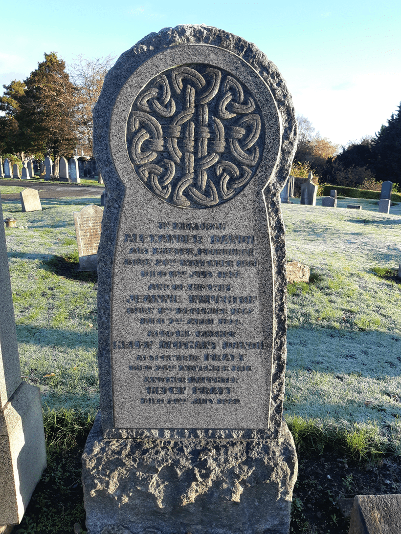 Art Master Alexander Dandie has a more celtic-inspired headstone, which may reflect his own creative interests. Born on 29th November 1861, he died on 6th July 1939. Born in Kirkcaldy, Fife, he was a ‘Teacher of Drawing’ for most of his life, previously having worked as a lithographic artist, according to the 1891 census.