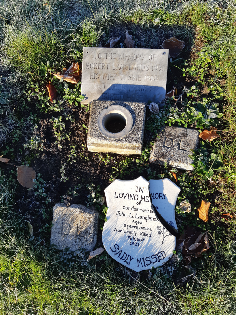 One such grave was marked with two markers of ‘D.L’, and two small plaques. This grave bears the plaque ‘To the memory of Robert Langlands 1951, his wife Jessie 1988 and their family are buried here.’ A simple, small sign seems to mark a plot of multiple burials including a young boy. A very poignant, broken shield caught my eye. It appeared home made or could be regarded as folk art. It reads ‘In loving memory of our dear wee son, John L. Langlands aged 3 years 9 mths. Accidentally killed Feb 20th 1931. Sadly Missed.