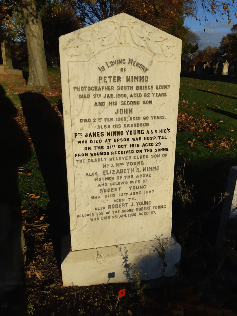 A bright white grave marks the resting place of Peter Nimmo and his family, including grandson James Nimmo who died at Epsom War Hospital in 1916 aged 29.