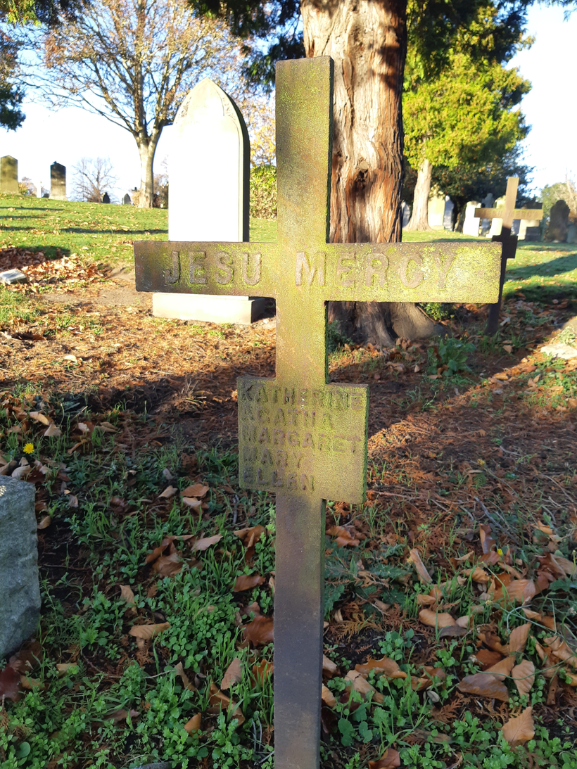 It reads ‘March 25th 1933, Dorothy Mary C.S.A.S. Sister of Mercy, Jesu Mercy’. While her name can be found on a catholic prayer list, I can find little else about her life. The other iron cross beside hers reads simply ‘Jesu Mercy, Polly, Sarah.’ A little further into the cemetery, another iron marker reading ‘Jesu Mercy, Katherine, Agatha, Margaret, Mary, Ellen’ suggests one of two things – paupers or nuns.