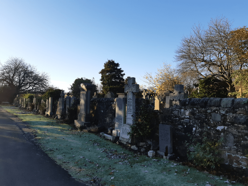 The war grave of G Stobie of the Royal Scots is close by and, unusually, commemorates a death outside of large national conflicts. Stobie died on 12th July 1921 aged 26.