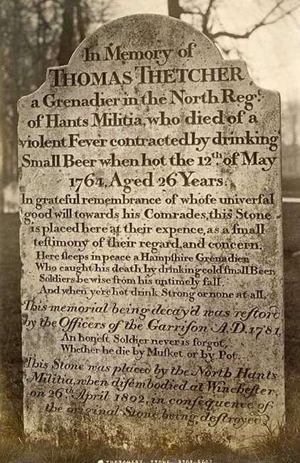 Thomas Thetcher, also known as the Hampshire Grenadier, died in 1764 and has become something of a local celebrity and historical curio thanks to both his epitaph and the nature of his death.