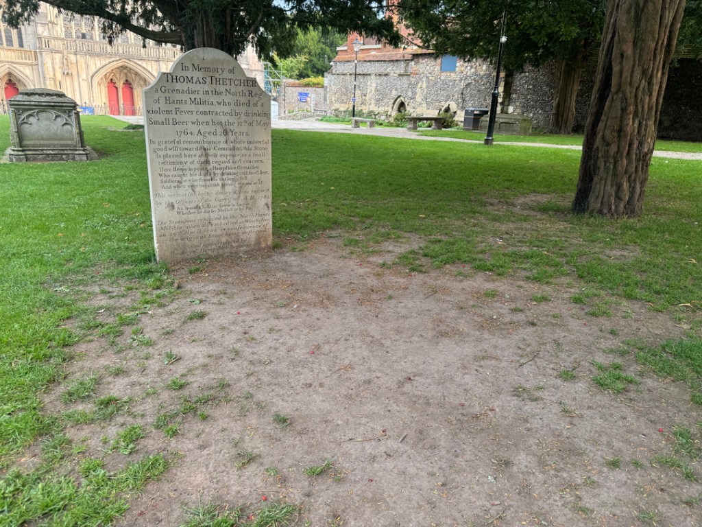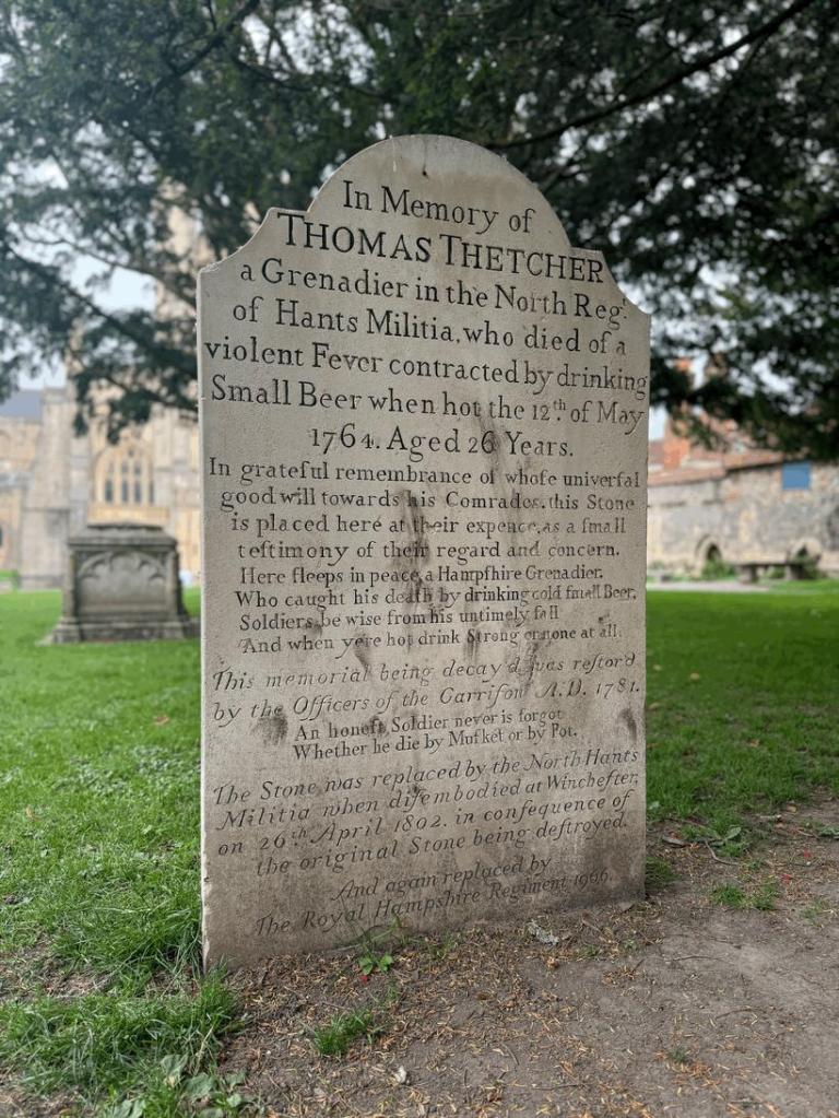 One of few remaining headstones in the grounds of Winchester Cathedral, the grave of Thomas Thetcher has been a beloved sight -and curio – for centuries.