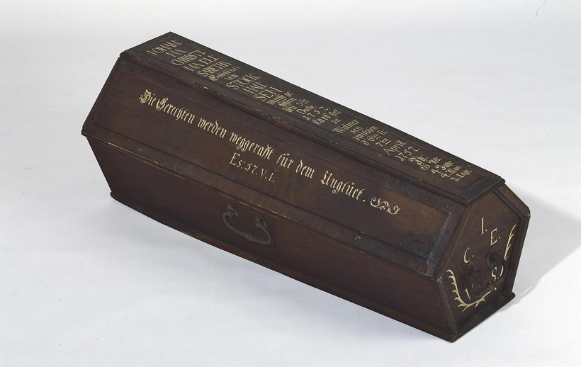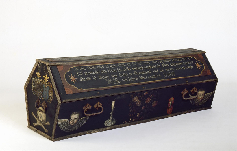The Stockhausen name applies to several families of noble status (Westphalian) with their collective family estate found in the town of Meschese in the Hochsauerland district. Other Stockhausen families laid roots in Thuringia and in Lower Saxony. The objects within the museum collection directly relate to the von Stockhausen family crypt in Trendelburg, where the Stockhausens call a stunning fairytale castle home. Images from inside the crypt suggest that many of the von Stockhausen caskets are beautifully painted and decorated, perhaps contributing to the desire to photograph their contents.