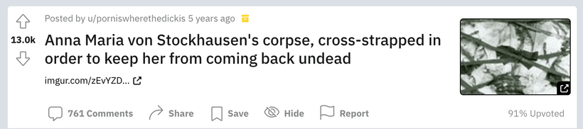 Posted in 2016 by the delightfully-named Reddit user u/porniswherethedickis, the photograph received thousands of upvotes. The image of the strapped mummy was uploaded to imgur on Oct 20th 2016 with the title ‘Anna Maria von Stockhausen’s corpse, cross-strapped in order to keep her from coming back undead.’ Noticeably, no mention of witchcraft here.