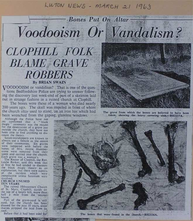 Later that same year, the heads of several cows and a horse were found in nearby woodland, all linking back to the happenings at Clophill, where St Mary’s was already renamed ‘the Haunted Church’. Thereafter, multiple copycat rituals occurred across the UK, particularly Lancashire, where animal remains were left in pseudo-Satanic displays across rural churches. Shortly afterwards, some Bedfordshire agricultural students confessed to killing a cockerel and drawing a cross as the church at Clophill as a ‘huge joke’ that no longer seemed funny, yet this was years before the graves were disturbed, and the real perpetrators of the grave damage at Clophill were never found.