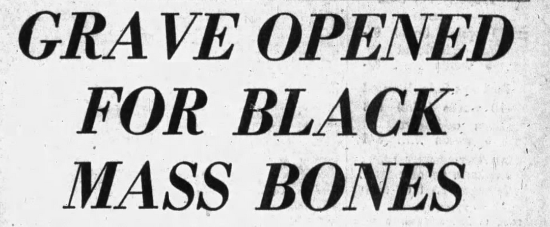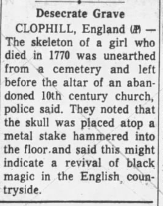 In 1963, two teenagers were seen playing with a human skull in the middle of the street. Considering both football and TV was accessible at this time, I’m baffled as to why a skull was a greater draw, but youngsters are strange beasts. When asked where they found their new plaything, they said that they had found it at the old church, jammed onto a piece of old window frame. When the police arrived, they reported finding several other human bones laid out inside the church, in what they described as a ‘pattern used for the Black Mass’, alongside bloodied cockerel feathers and red crosses. While these words came from newspaper reports, we must take into account that terms such as ‘black mass’ and ‘satanism’ were used as inflammatory phrases, informed by horror films and a LOT of Dennis Wheatley adaptations.