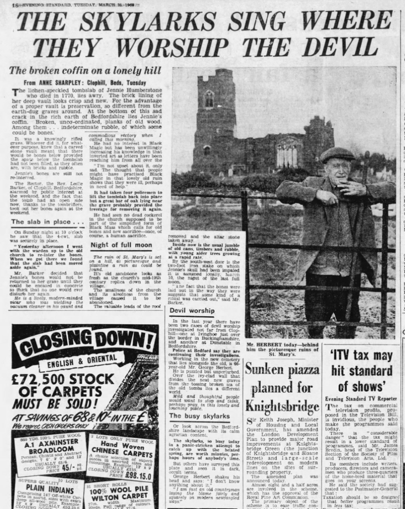 However, the rector of Clophill reported that further damage had occurred on site, as the graves of several women had been damaged, while the grave of one Jenny Humberstone, who died in 1770, had been not only damaged but opened, her coffin unearthed and split open like a deathly kinder egg. The bones scattered throughout the church, were 22-year-old Jenny’s. Both he and his churchwarden were keen to place themselves as experts in Satanic rituals and occult tradition, remarking that the desecration was at the hands of such dark religious extremists, and not that of local vandals. Similarly, the rector confirmed that Satanists always focus their ritual worship around women – dead or alive. Many of the assertions made by clergy have since been reappraised by contemporary commentators and seen to be equally as misinformed and influenced by popular horror media, as much as the newspapers themselves.