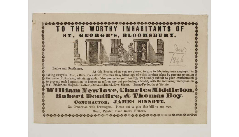 Giving refuse collectors a small Christmas bonus seems an obvious nicety of the season, but before the mid-19th century, they went home with empty pockets and no Christmas bonus to help with the costs of festivities. In 1846, four London dustmen printed up stacks of handbills to post through the doors of residents on their rounds.