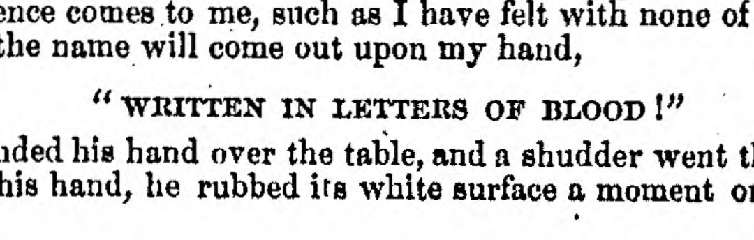 While Foster’s blush and skin-writing abilities are chronicled, as are his so-called ‘Blood Letters’. While this sounds like an excellent death metal band, it appears as a mere escalation of his skin-writing. In one instance, a writer from the New York Era remarks ‘Third, at Mr. Foster’s request we thought of the name of a deceased lady friend, a girl who had been dead for years; and lo! on, or rather under Mr. Foster’s arm, on the surface, there appeared in pink, or blood, the letters of that dead one’s name. We then thought of a male friend, deceased; and lo! his name appeared on the back of Mr. Foster’s baud in blood-red letters.’[2] These remarks of blood, often of a ‘fiery red colour’, are regarded as appearing in initials on Foster’s hands, and are rather more dramatic than the gentle blush scripts of the British reports.