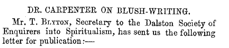 Submitted to The Spiritualist was a short sequence of correspondence between Thomas Blyton, Secretary and Treasurer, and Dr W. B. Carpenter, M.D., F.R.S., &c. &c., Registrar of London University and President of the British Association.