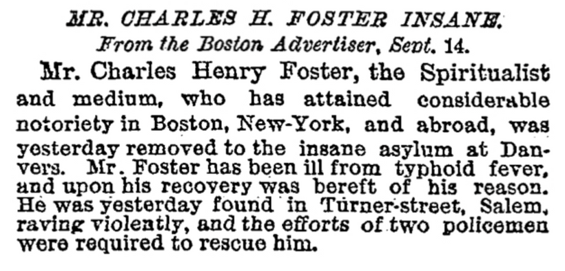 According to the biography, Foster died aged 52 in spiritual bliss, where ‘a calm followed the tempest ; the skies cleared ; the music of the spheres sounded in his ears ; spirit friends, kind and wise, clustered round his bed, and welcomed him with open arms into their fairer state of being. . On entering the spirit-world with health, youth and mental vigor more than renewed, he commences a work beyond all that in his palmiest days could ever have been accomplished through him in the body.’ Other accounts of this life – including a profile by Arthur Conan Doyle – describe his erratic behaviours in more detail, suggesting he was living with an undiagnosed mental illness such as schizophrenia, even spending time in an asylum. Foster died shortly after his release from the institution, when he was also believed to be suffering from ‘typhoid fever’. Regardless of the varying beliefs in Foster’s legitimacy as a medium, we can but hope that his end was peaceful. His curious legacy as the famous, handsome, ‘Salem Seer’ is certainly one to be celebrated.