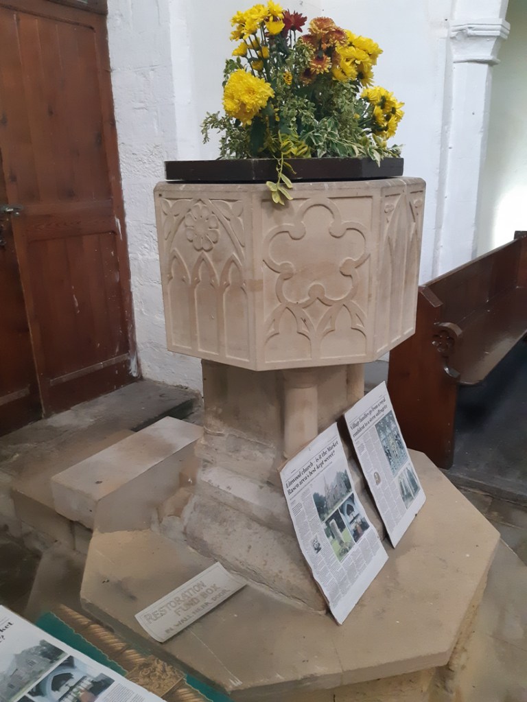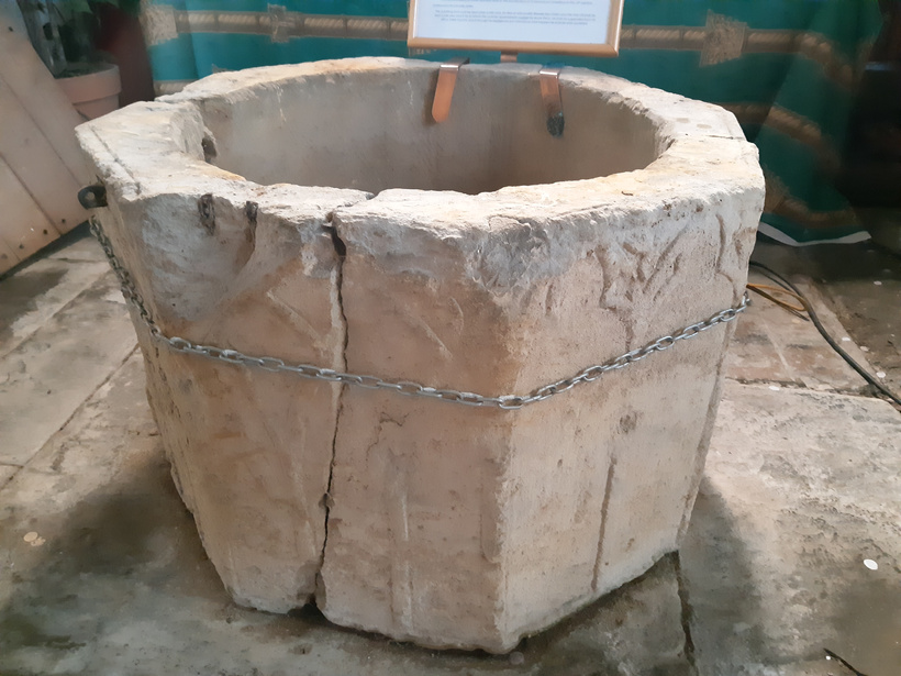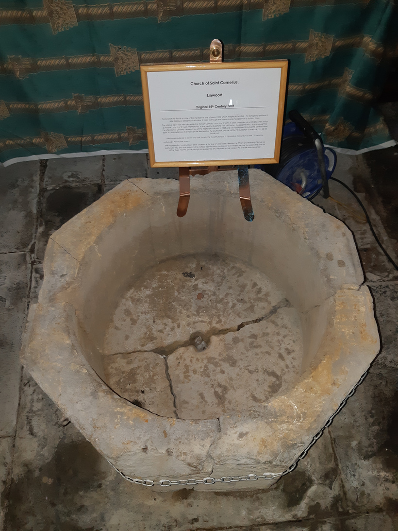 There are two fonts inside Linwood – one is a more modern (Victorian) octagonal example, with crisp gothic window-inspired patterning to the sides. However, the most exciting font sits on the ground in two parts, held together with a chain. While unclear from signage, this represents the original 14th century medieval font that was replaced by the Victorians in 1868.