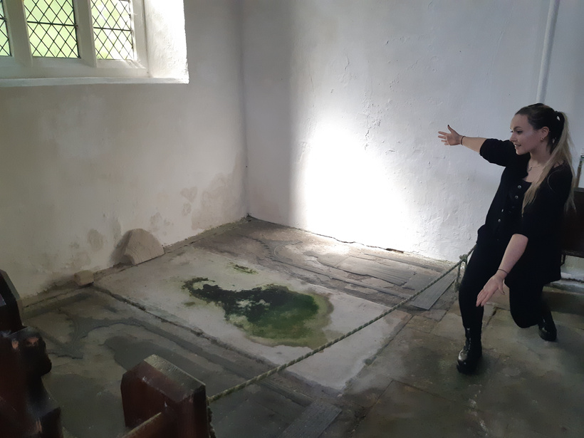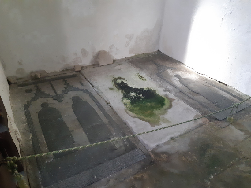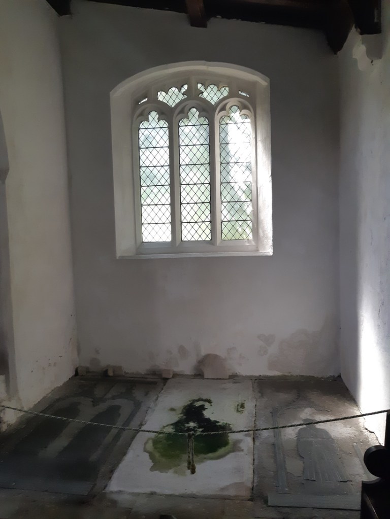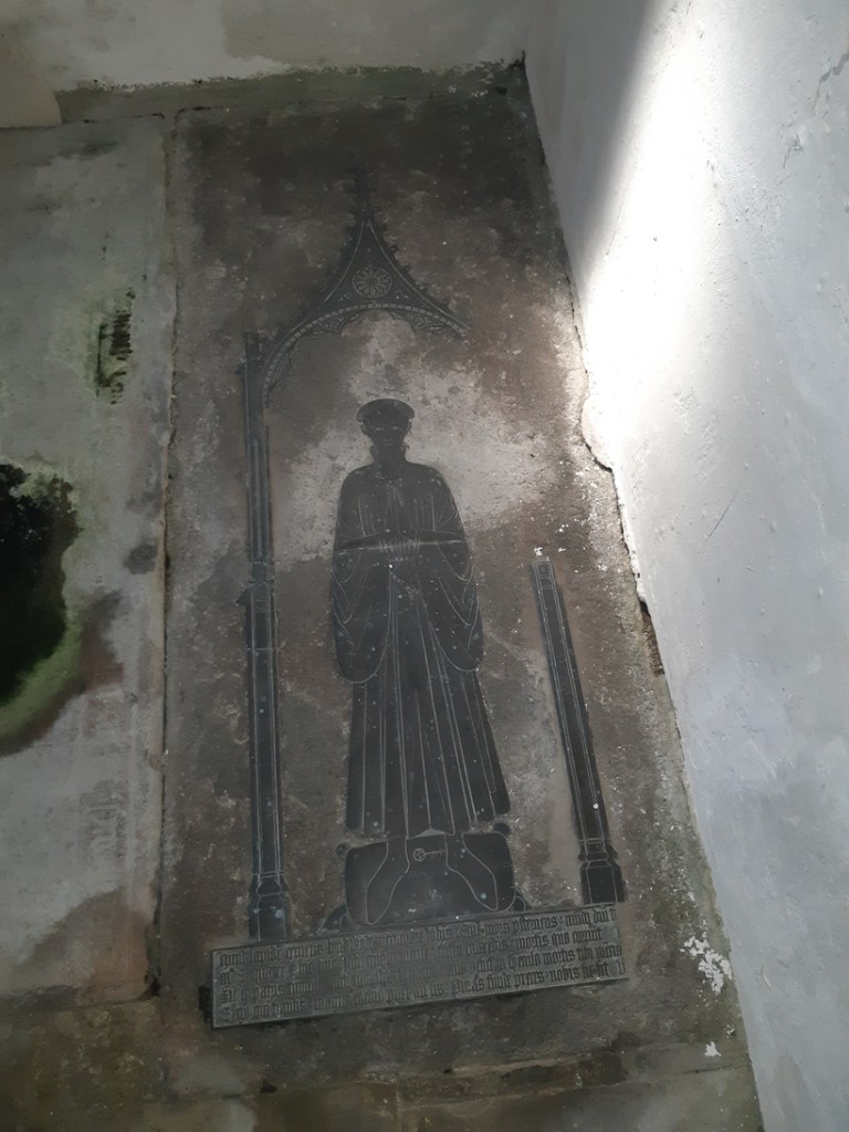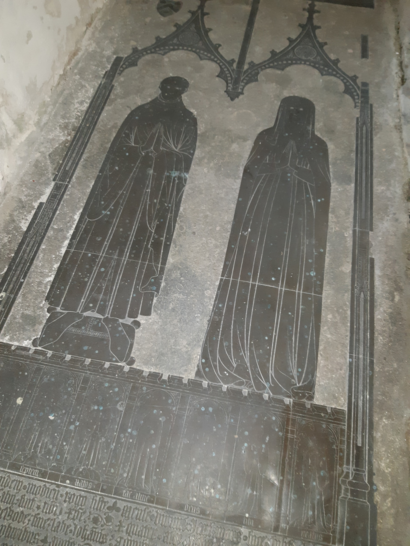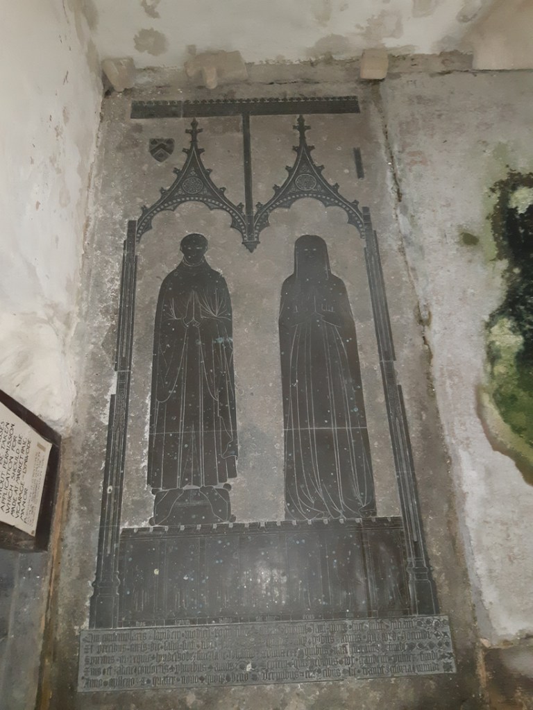 Both brasses are protected by a small rope, and have also survived the dark, damp conditions of the church. And, judging by other signage, it survived decades of brass-rubbing hobbyists who may have inadvertently worn down the engraved surfaces with their tools.