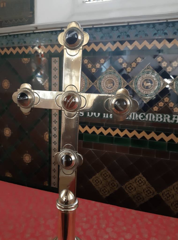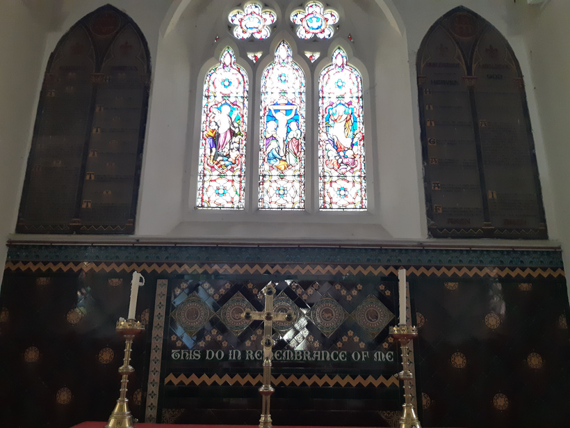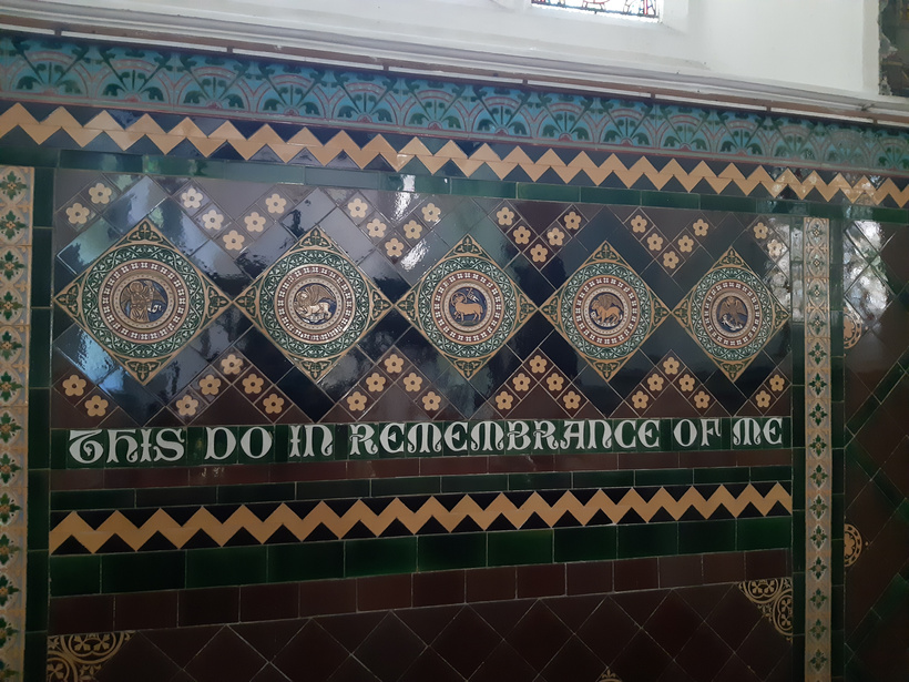 The east wall and altar area (reredos) of Linwood church is decorated with beautiful Victorian majolica tiling, covered with religious lettering and symbols of lambs and staffs in medallions.