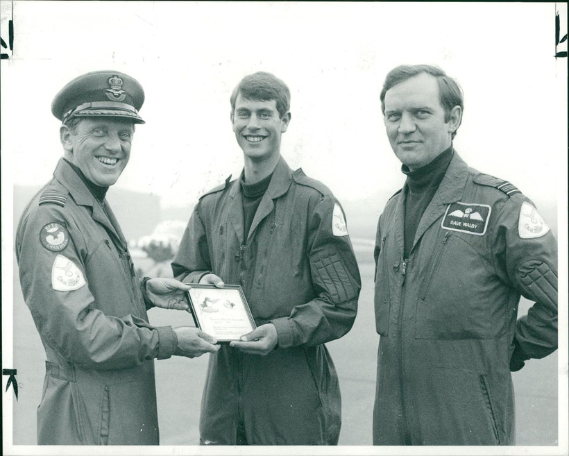 “Prince Edward receiving his first solo flying certificate at the RAF Basic Flying Training School, Cranwell, from Group Captain Dick Joyce, the school’s commanding officer. With them is Squadron Leader David Walby, who instructed the Prince in a Bulldog trainer aircraft during the three-week course.”